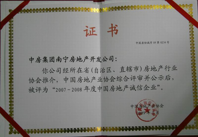 熱烈祝賀中房集團(tuán)南寧房地產(chǎn)開發(fā)公司榮獲2007-2008年度中國(guó)房地產(chǎn)誠(chéng)信企業(yè)